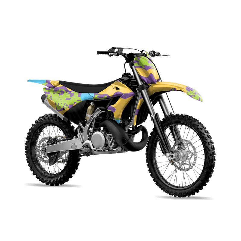 Compound Carnival reimagines the classic digital camo by infusing it with bold splashes of colorful ink. This unique blend of pixelated structure and vibrant detail creates a camo pattern that feels both modern and artistic. Compound is the ideal choice for riders who want their dirt bike to showcase energy, color, and a disruptive style that still nods to traditional camouflage roots.