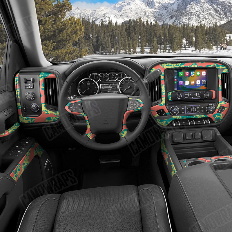 Upgrade your ride's interior with Compound Fiesta Car Interior Skins, a branded CamoWraps pattern that reimagines digital camouflage with a vibrant twist. The Compound design blends traditional pixel-style camo with colorful ink splatters, creating a bold, high-energy look that’s both tactical and artistic. Perfect for drivers who want to stand out while keeping that structured, military-inspired feel, this pattern adds eye-catching texture to your dashboard, door panels, and trim.