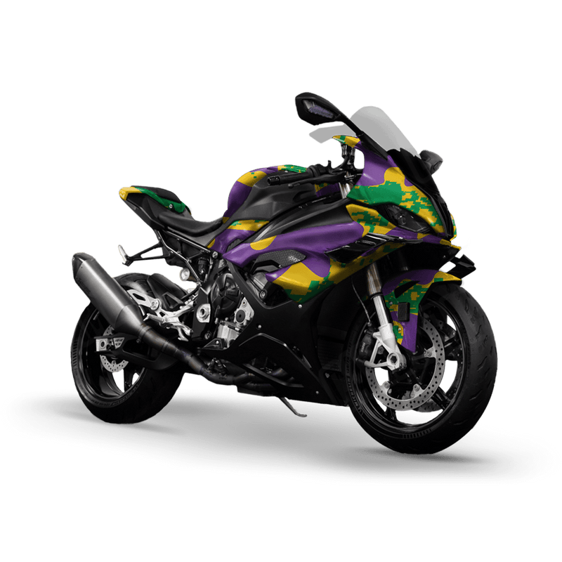Turn your sport bike into a rolling work of art with Compound Mardi Gras Sports Bike Wrap. The Compound design reimagines traditional digital camouflage by layering it with bursts of colorful ink splatters. The result is a chaotic yet stylish mix of precision and creativity—perfect for riders who want a one-of-a-kind look that’s bold, vibrant, and impossible to ignore.