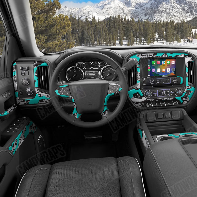 Upgrade your ride's interior with Compound Tiffany Blue Tiger Car Interior Skins, a branded CamoWraps pattern that reimagines digital camouflage with a vibrant twist. The Compound design blends traditional pixel-style camo with colorful ink splatters, creating a bold, high-energy look that’s both tactical and artistic. Perfect for drivers who want to stand out while keeping that structured, military-inspired feel, this pattern adds eye-catching texture to your dashboard, door panels, and trim.