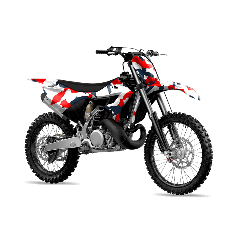 Erratic America features a chaotic collision of jagged shapes and shifting colors, creating a camo pattern that feels wild yet uniform. Designed to stand out while still holding a rugged edge, Erratic is perfect for riders who want their dirt bike to showcase energy, unpredictability, and a truly unique take on camouflage.