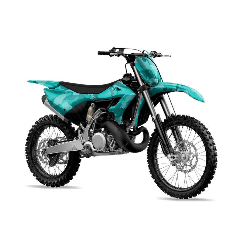 Erratic Elite Tiffany Blue features a chaotic collision of jagged shapes and shifting colors, creating a camo pattern that feels wild yet uniform. Designed to stand out while still holding a rugged edge, Erratic is perfect for riders who want their dirt bike to showcase energy, unpredictability, and a truly unique take on camouflage.