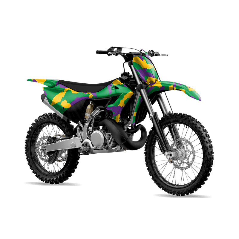 Erratic Mardi Gras features a chaotic collision of jagged shapes and shifting colors, creating a camo pattern that feels wild yet uniform. Designed to stand out while still holding a rugged edge, Erratic is perfect for riders who want their dirt bike to showcase energy, unpredictability, and a truly unique take on camouflage.