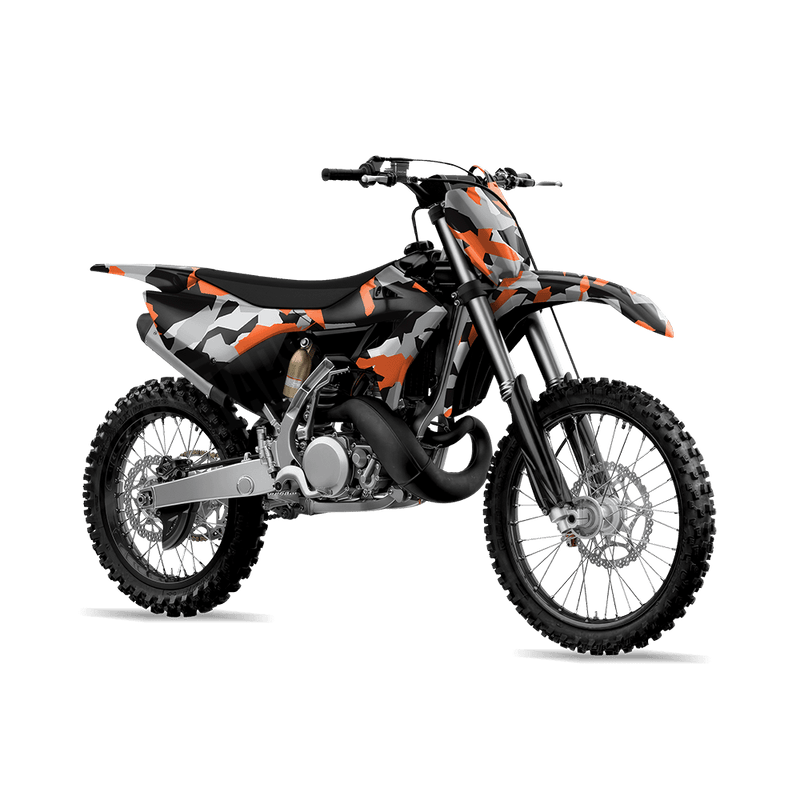 Erratic Orange Tiger features a chaotic collision of jagged shapes and shifting colors, creating a camo pattern that feels wild yet uniform. Designed to stand out while still holding a rugged edge, Erratic is perfect for riders who want their dirt bike to showcase energy, unpredictability, and a truly unique take on camouflage.