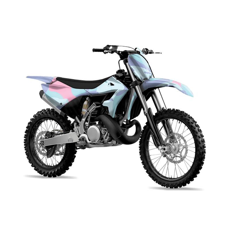 Ragged Cotton Candy takes the familiar look of traditional military camouflage and gives it a rugged, updated twist. With slightly broken edges and subtle variations, Ragged creates a raw and weathered style that feels both classic and fresh. This pattern is perfect for riders who want their dirt bike to carry a proven camo design with a tougher, more distressed edge.