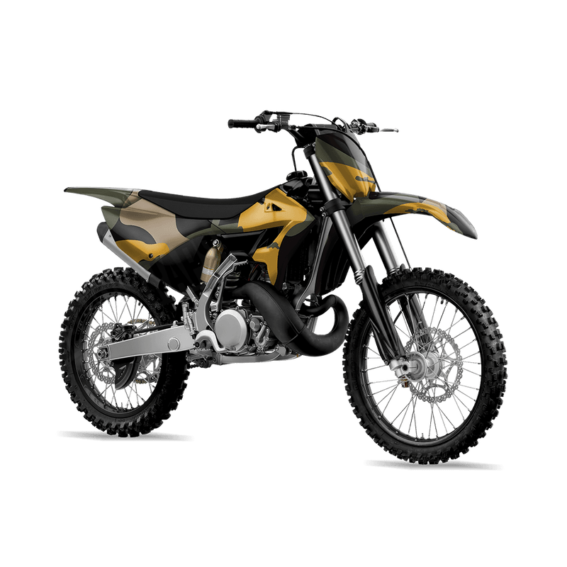 Ragged Militant Yellow takes the familiar look of traditional military camouflage and gives it a rugged, updated twist. With slightly broken edges and subtle variations, Ragged creates a raw and weathered style that feels both classic and fresh. This pattern is perfect for riders who want their dirt bike to carry a proven camo design with a tougher, more distressed edge.