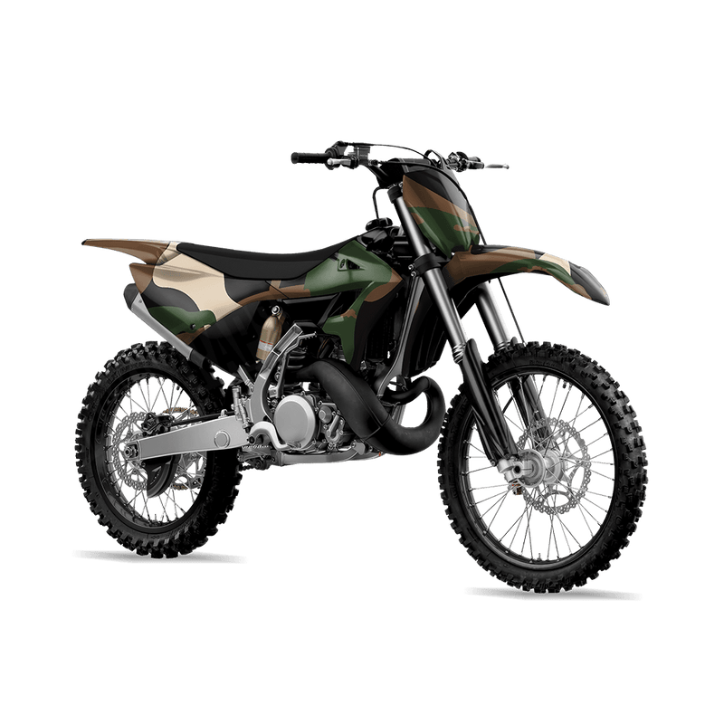 Ragged Woodland takes the familiar look of traditional military camouflage and gives it a rugged, updated twist. With slightly broken edges and subtle variations, Ragged creates a raw and weathered style that feels both classic and fresh. This pattern is perfect for riders who want their dirt bike to carry a proven camo design with a tougher, more distressed edge.