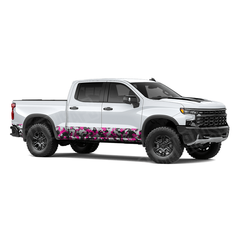 Cumulus Magenta Tiger Rocker Panel Camo Wrap adds a soft camo touch and long-lasting protection to your truck’s lower body.