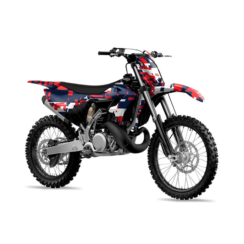 Digital America delivers the sharp, pixelated look of modern military camouflage. Built from varying-sized digital blocks, this design creates a clean, tech-inspired camo that feels both tactical and futuristic. For riders who want their dirt bike to stand out with a strong, structured pattern rooted in military heritage, Digital brings a bold and unmistakable style.