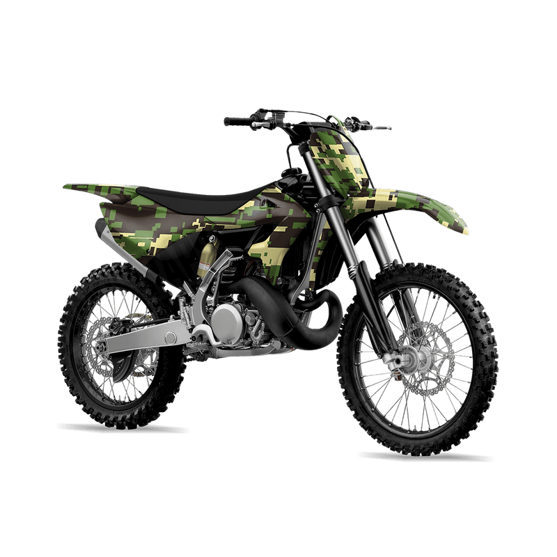 Digital Jungle delivers the sharp, pixelated look of modern military camouflage. Built from varying-sized digital blocks, this design creates a clean, tech-inspired camo that feels both tactical and futuristic. For riders who want their dirt bike to stand out with a strong, structured pattern rooted in military heritage, Digital brings a bold and unmistakable style.