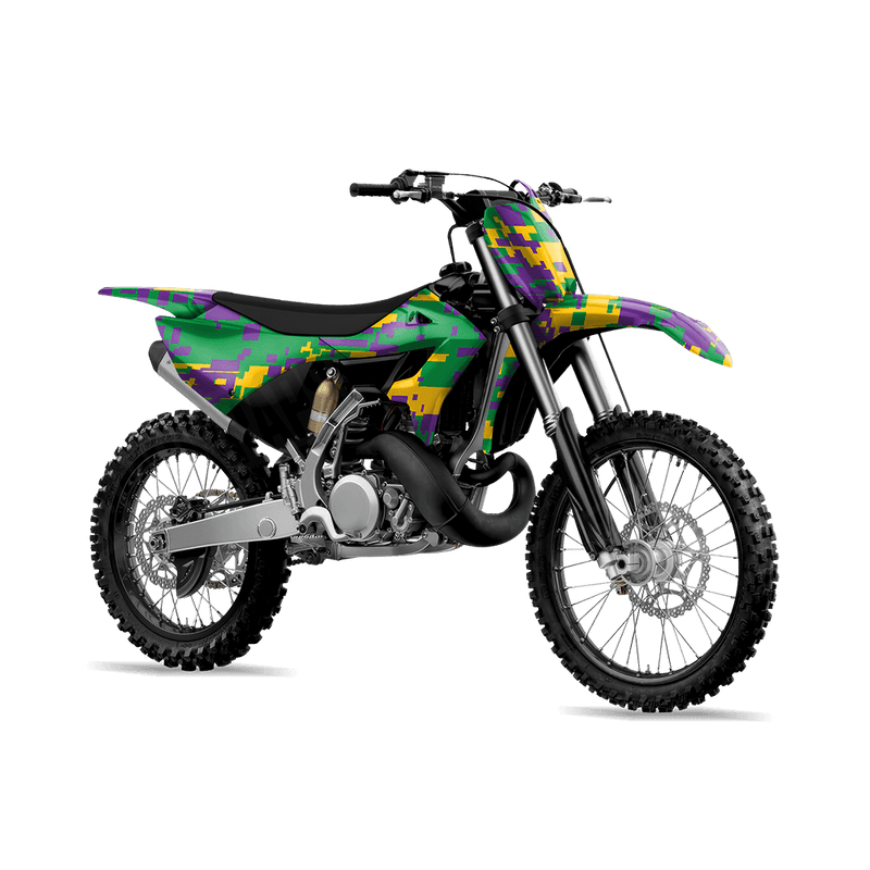 Digital Mardi Gras delivers the sharp, pixelated look of modern military camouflage. Built from varying-sized digital blocks, this design creates a clean, tech-inspired camo that feels both tactical and futuristic. For riders who want their dirt bike to stand out with a strong, structured pattern rooted in military heritage, Digital brings a bold and unmistakable style.