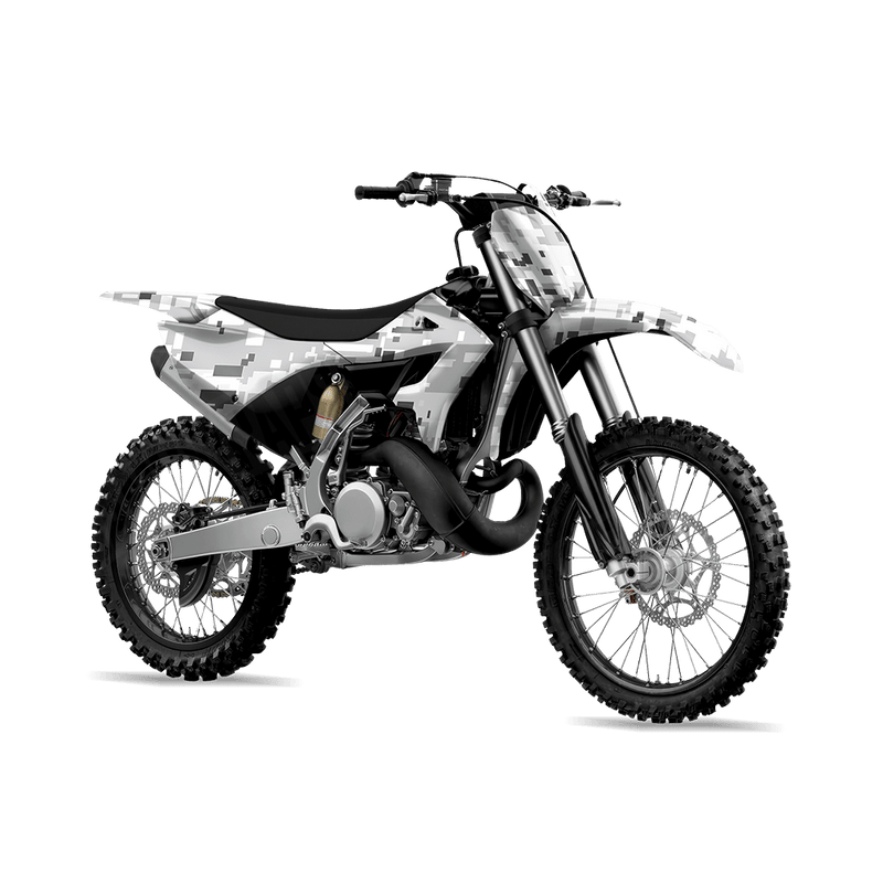 Digital Snow delivers the sharp, pixelated look of modern military camouflage. Built from varying-sized digital blocks, this design creates a clean, tech-inspired camo that feels both tactical and futuristic. For riders who want their dirt bike to stand out with a strong, structured pattern rooted in military heritage, Digital brings a bold and unmistakable style.
