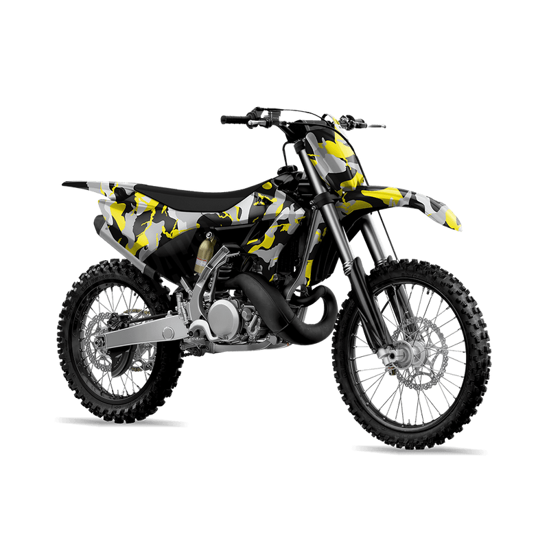 Ragged Yellow Tiger takes the familiar look of traditional military camouflage and gives it a rugged, updated twist. With slightly broken edges and subtle variations, Ragged creates a raw and weathered style that feels both classic and fresh. This pattern is perfect for riders who want their dirt bike to carry a proven camo design with a tougher, more distressed edge.