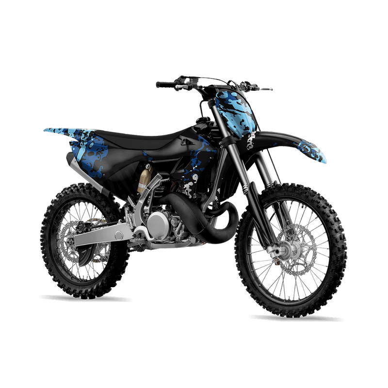 Pasted Baby Blue combines splattered paint textures with classic camouflage design, creating a bold and layered look. By overlapping multiple paint tones, this pattern delivers an energetic and artistic take on camo while still holding onto a rugged edge. Pasted is the perfect choice for riders who want their dirt bike to showcase creativity with a tough, camo-driven foundation.