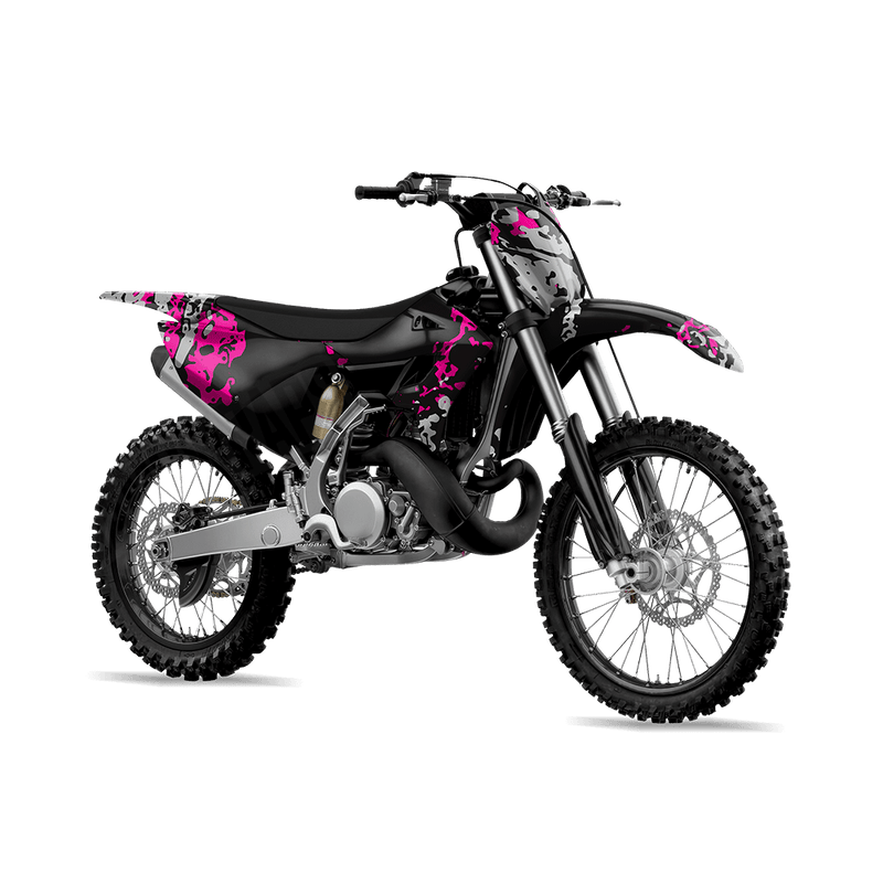 Pasted Magenta Tiger combines splattered paint textures with classic camouflage design, creating a bold and layered look. By overlapping multiple paint tones, this pattern delivers an energetic and artistic take on camo while still holding onto a rugged edge. Pasted is the perfect choice for riders who want their dirt bike to showcase creativity with a tough, camo-driven foundation.