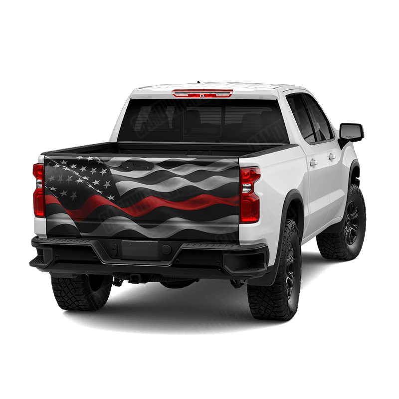 Patriotic Firefighter Service Flag Tailgate Wraps are precision-cut to fit compact and full-size truck tailgates, offering full coverage and a clean, professional finish. The vivid red stripe against the grayscale American flag delivers a striking, meaningful look that honors true bravery.