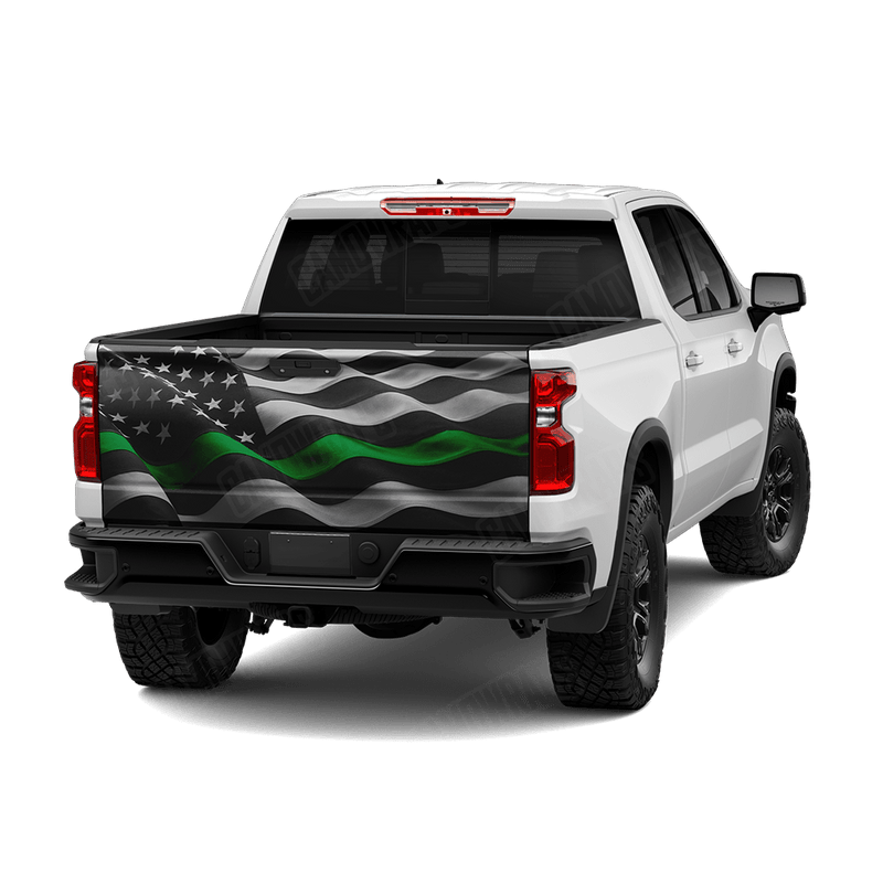Show your pride and respect for America’s heroes with the Patriotic Military Service Flag Tailgate Vinyl Wrap. Featuring a striking red, white, and blue flag accented with a bold green line, this design honors the courage, sacrifice, and dedication of U.S. military members. It’s a powerful statement of patriotism and gratitude, making your truck stand out with honor and pride.