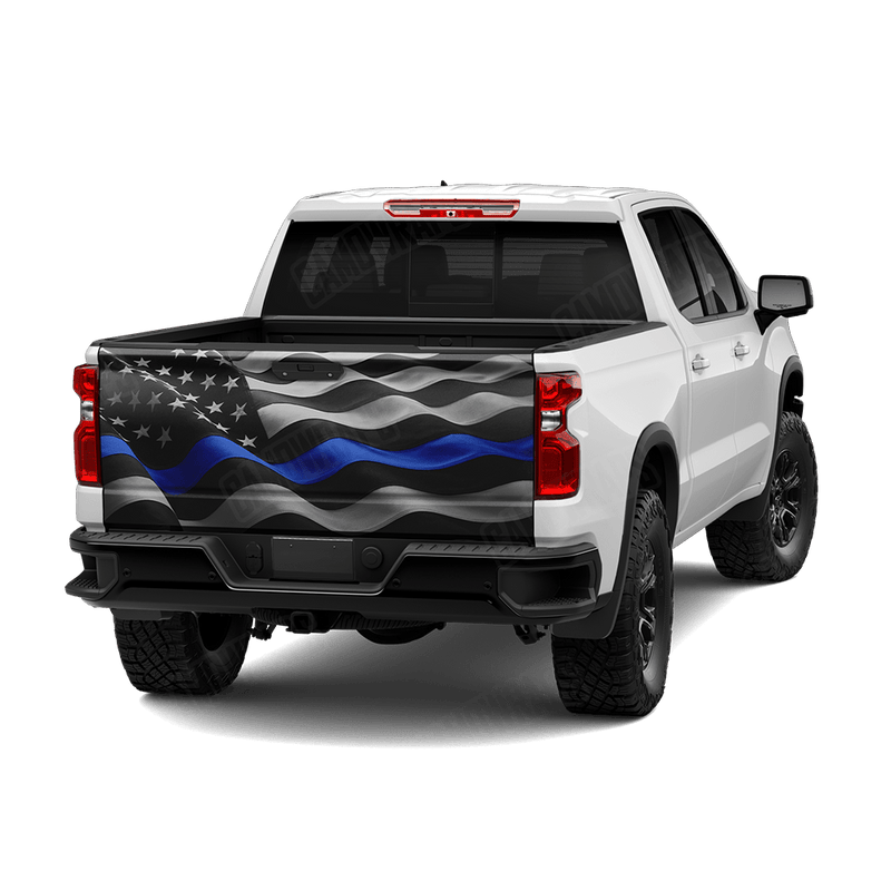 Patriotic Police Service Flag Tailgate Wraps are built for precision and performance. Designed to fit compact and full-size truck tailgates, each wrap offers full coverage, vibrant detail, and a smooth, professional finish.