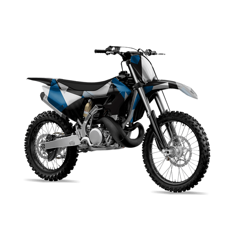 Shattered Blue Tiger takes traditional camouflage and breaks it apart with sharp, angular edges for a bold retro-inspired look. With its fractured shapes and geometric feel, Shattered delivers a unique style that feels both rugged and edgy. It’s the perfect camo for riders who want their dirt bike to stand out with a design that’s aggressive yet clean.