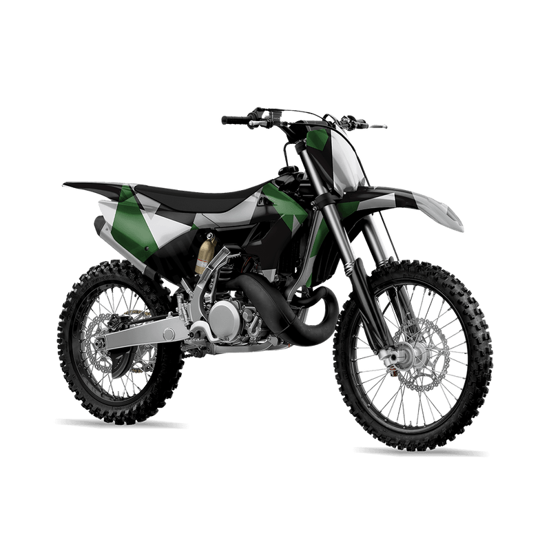 Shattered Green Tiger takes traditional camouflage and breaks it apart with sharp, angular edges for a bold retro-inspired look. With its fractured shapes and geometric feel, Shattered delivers a unique style that feels both rugged and edgy. It’s the perfect camo for riders who want their dirt bike to stand out with a design that’s aggressive yet clean.