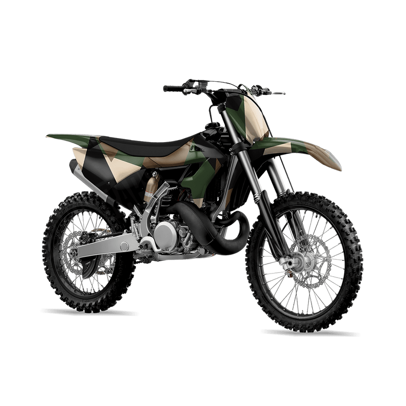Shattered Woodland takes traditional camouflage and breaks it apart with sharp, angular edges for a bold retro-inspired look. With its fractured shapes and geometric feel, Shattered delivers a unique style that feels both rugged and edgy. It’s the perfect camo for riders who want their dirt bike to stand out with a design that’s aggressive yet clean.