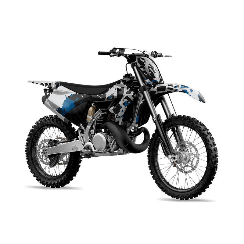 Tire Splatter Blue Tiger combines rugged tire mark patterns with bold paint splatters, giving your dirt bike a tough yet colorful look. This design feels raw and aggressive, with streaks and splashes that mimic the chaos of off-road riding. For riders who want a wrap that captures the energy of the trail while adding artistic flair, Tire Splatter delivers the perfect mix of grit and style.
