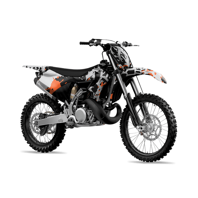 Tire Splatter Orange Tiger combines rugged tire mark patterns with bold paint splatters, giving your dirt bike a tough yet colorful look. This design feels raw and aggressive, with streaks and splashes that mimic the chaos of off-road riding. For riders who want a wrap that captures the energy of the trail while adding artistic flair, Tire Splatter delivers the perfect mix of grit and style.
