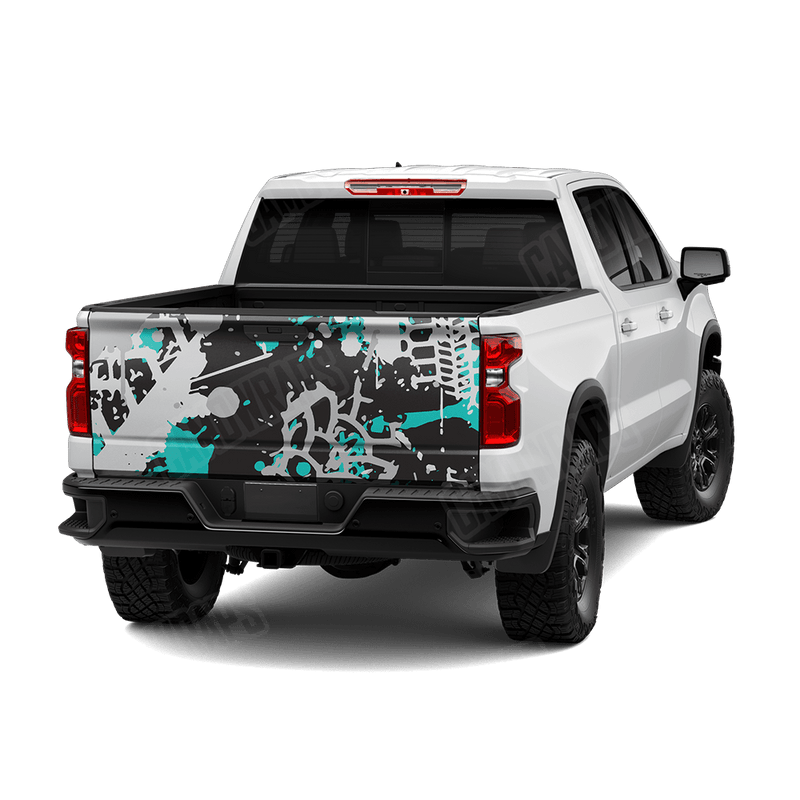 Tear up the road with Tire Splatter Tiffany Blue Tiger Tailgate Camo Wrap, a high-octane camo design from CamoWraps that fuses tire track impressions with gritty paint splatter. Built for off-roaders and thrill-seekers, this design delivers raw motion and power for any compact or full-size truck.