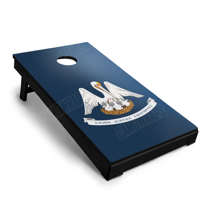 Transform your Cornhole Board with Louisiana State Flag Cornhole Boards, highlighting the pelican emblem and rich blue field that represent Louisiana’s heritage, resilience, and southern pride. This distinctive flag design delivers powerful symbolism and bold visual appeal.