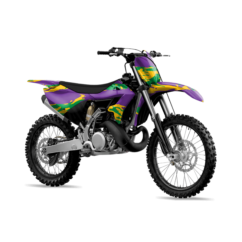 Vietnam Tiger Stripe Mardi Gras draws inspiration from the legendary Tiger Stripe camouflage used during the Vietnam War. Known for its bold slashing lines and unique blend of greens, browns, and blacks, this historic pattern delivers both heritage and style. On your dirt bike, Vietnam Tiger Stripe brings a retro military edge that pays homage to its roots while giving your ride a fierce and timeless look.
